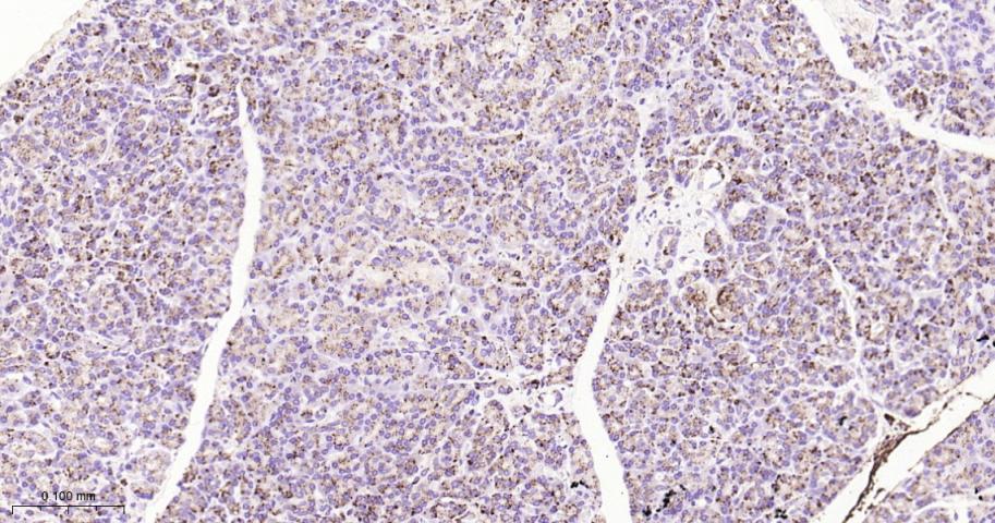 Paraformaldehyde-fixed, paraffin embedded Mouse Pancreas; Antigen retrieval by boiling in sodium citrate buffer (pH6.0) for 15 min; Antibody incubation with Cathepsin D Monoclonal Antibody, Unconjugated(bsm-61164R) at 1:200 overnight at 4°C, followed by conjugation to the bs-0295G-HRP and DAB (C-0010) staining.