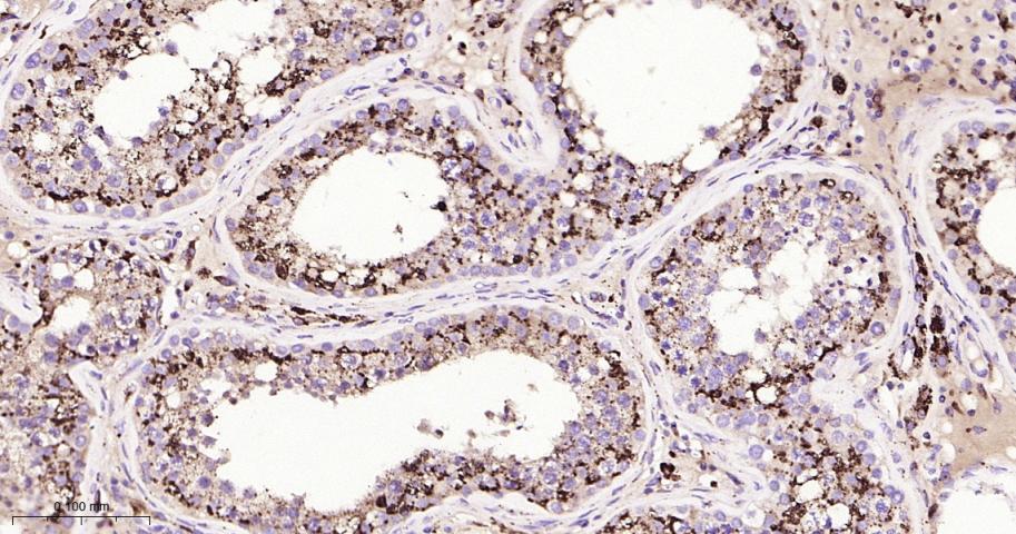 Paraformaldehyde-fixed, paraffin embedded Human Testicles; Antigen retrieval by boiling in sodium citrate buffer (pH6.0) for 15 min; Antibody incubation with Cathepsin D Monoclonal Antibody, Unconjugated(bsm-61164R) at 1:200 overnight at 4°C, followed by conjugation to the bs-0295G-HRP and DAB (C-0010) staining.