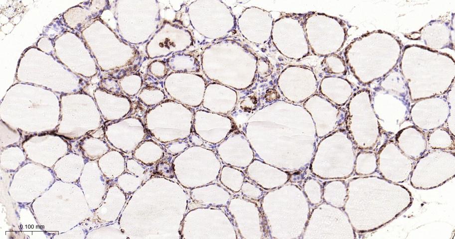 Paraformaldehyde-fixed, paraffin embedded Human Thyroid Gland; Antigen retrieval by boiling in sodium citrate buffer (pH6.0) for 15 min; Antibody incubation with Cathepsin D Monoclonal Antibody, Unconjugated(bsm-61164R) at 1:200 overnight at 4°C, followed by conjugation to the bs-0295G-HRP and DAB (C-0010) staining.