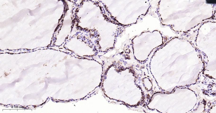 Paraformaldehyde-fixed, paraffin embedded Mouse Thyroid Gland; Antigen retrieval by boiling in sodium citrate buffer (pH6.0) for 15 min; Antibody incubation with Cathepsin D Monoclonal Antibody, Unconjugated(bsm-61164R) at 1:200 overnight at 4°C, followed by conjugation to the bs-0295G-HRP and DAB (C-0010) staining.