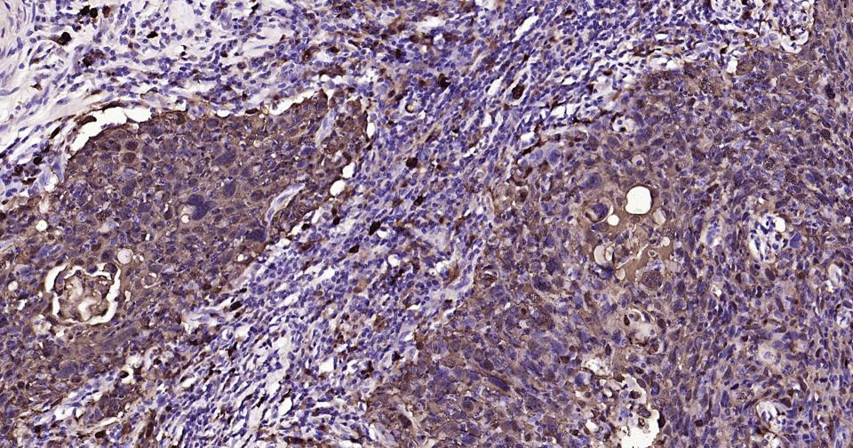 Paraformaldehyde-fixed, paraffin embedded Human Cervical Cancer; Antigen retrieval by boiling in sodium citrate buffer (pH6.0) for 15 min; Antibody incubation with S100A8 Monoclonal Antibody, Unconjugated(bsm-61167R) at 1:200 overnight at 4°C, followed by conjugation to the SP Kit (Rabbit, SP-0023)and DAB (C-0010) staining.