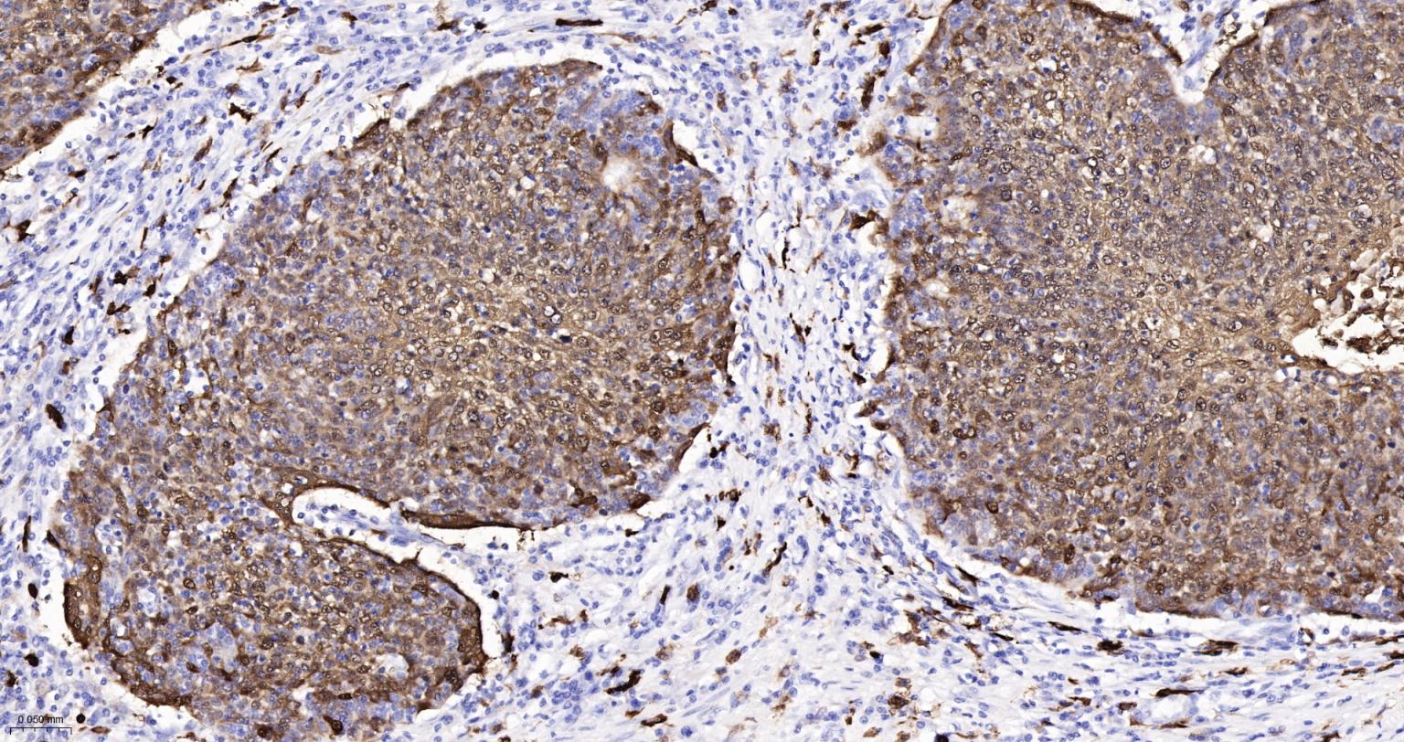 Paraformaldehyde-fixed, paraffin embedded Human Skin Cancer; Antigen retrieval by boiling in sodium citrate buffer (pH6.0) for 15 min; Antibody incubation with S100A8 Monoclonal Antibody, Unconjugated(bsm-61167R) at 1:200 overnight at 4°C, followed by conjugation to the SP Kit (Rabbit, SP-0023)and DAB (C-0010) staining.