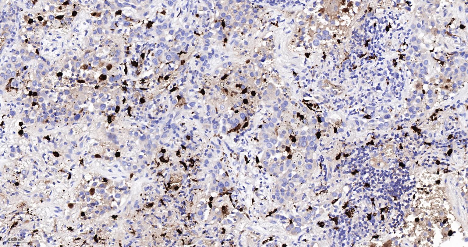 Paraformaldehyde-fixed, paraffin embedded Human Lung Cancer; Antigen retrieval by boiling in sodium citrate buffer (pH6.0) for 15 min; Antibody incubation with S100A8 Monoclonal Antibody, Unconjugated(bsm-61167R) at 1:200 overnight at 4°C, followed by conjugation to the SP Kit (Rabbit, SP-0023)and DAB (C-0010) staining.
