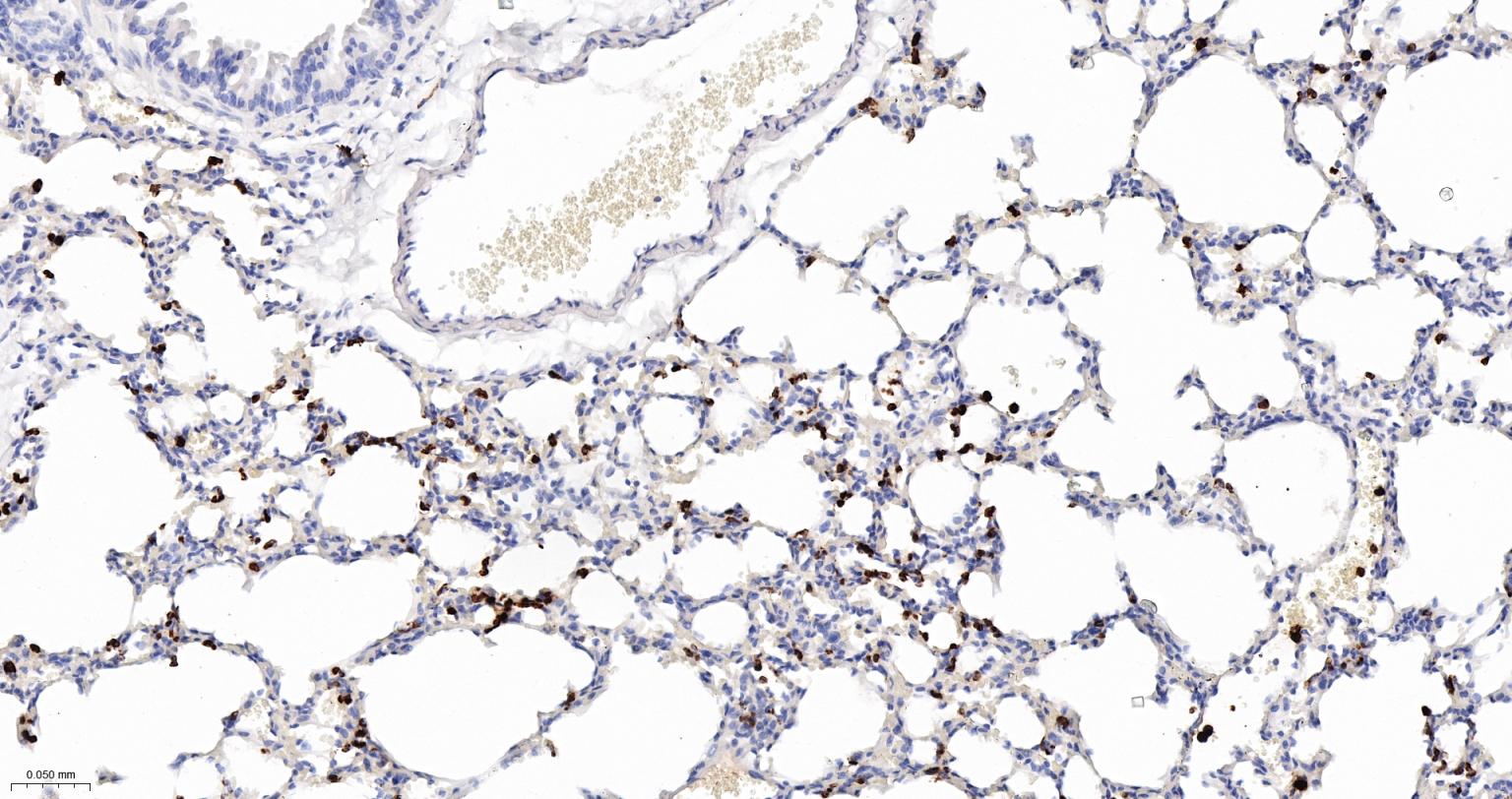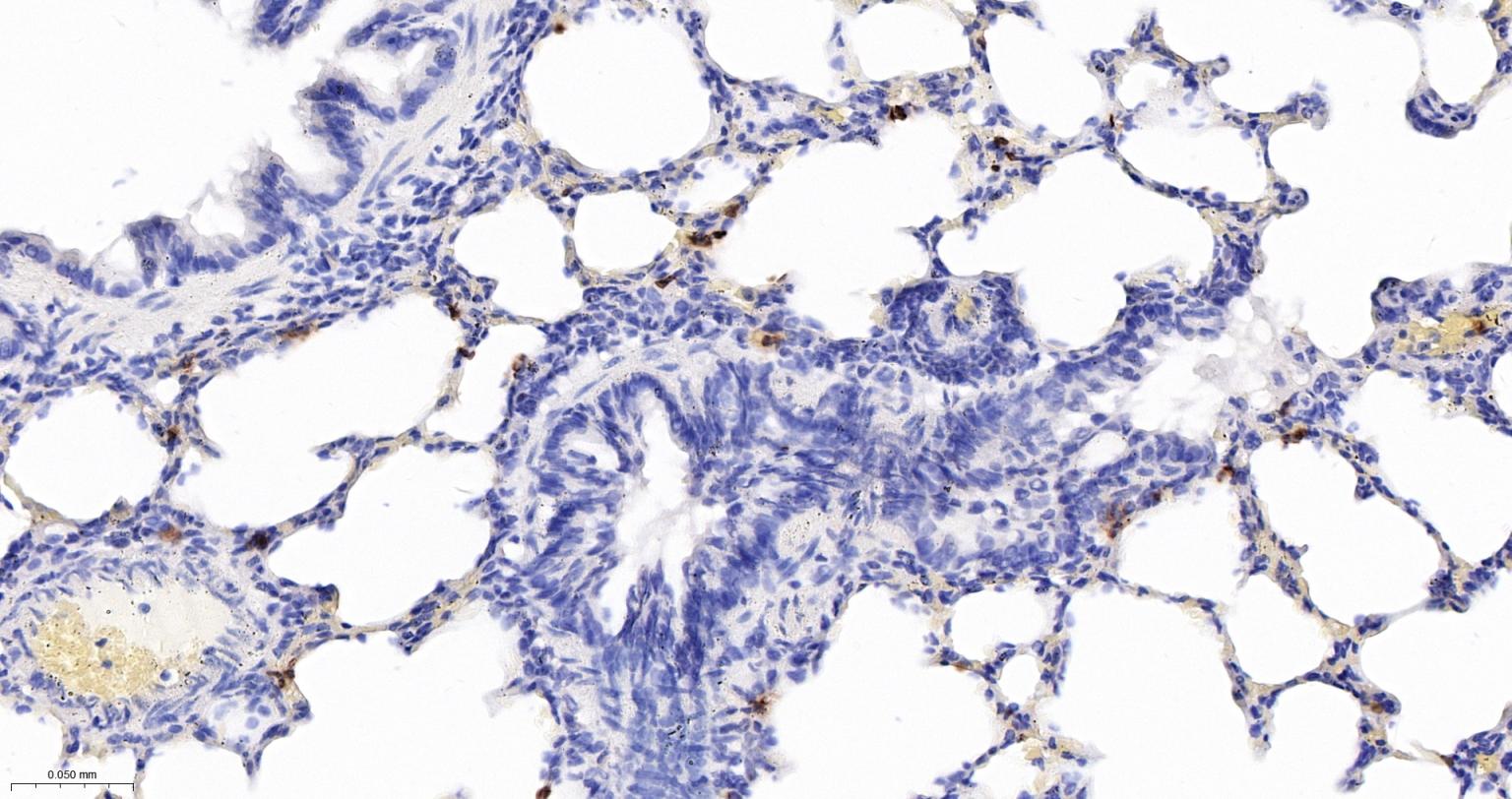 Paraformaldehyde-fixed, paraffin embedded Rat Lung; Antigen retrieval by boiling in sodium citrate buffer (pH6.0) for 15 min; Antibody incubation with S100A8 Monoclonal Antibody, Unconjugated(bsm-61167R) at 1:200 overnight at 4°C, followed by conjugation to the bs-0295G-HRP and DAB (C-0010) staining.