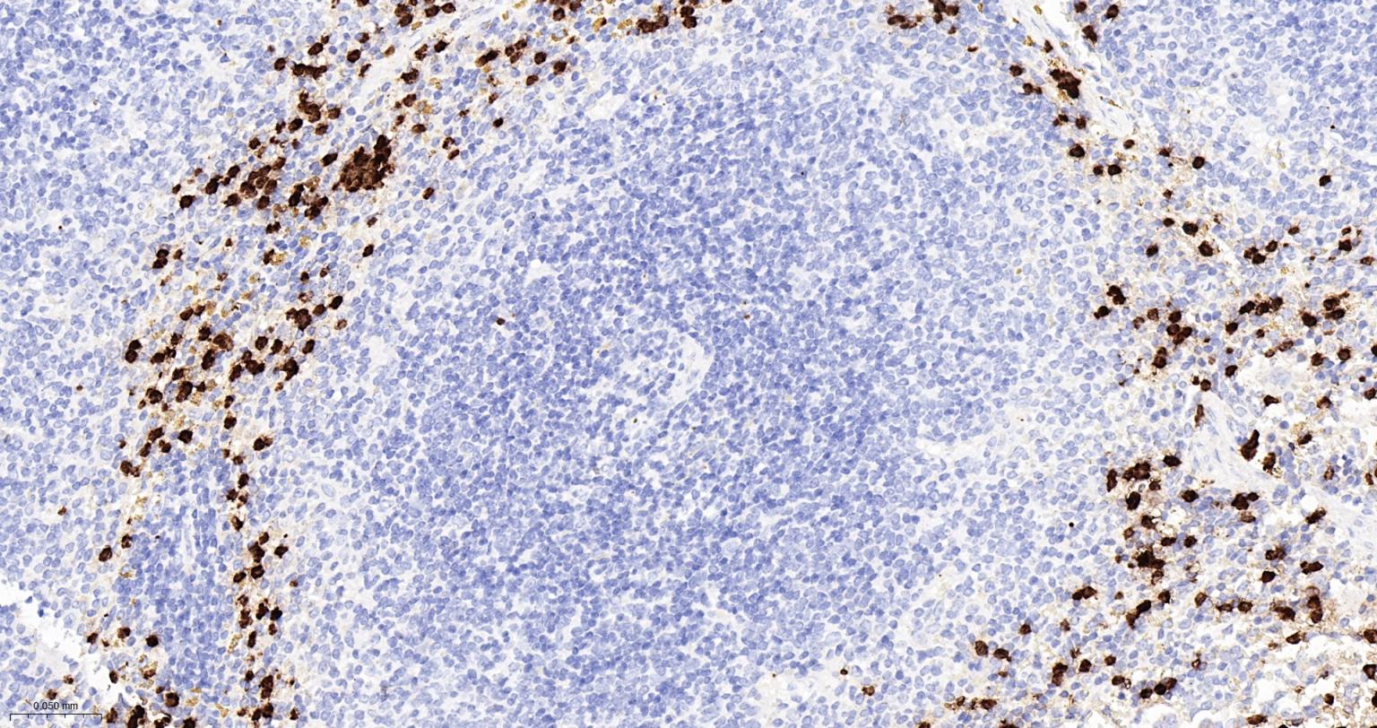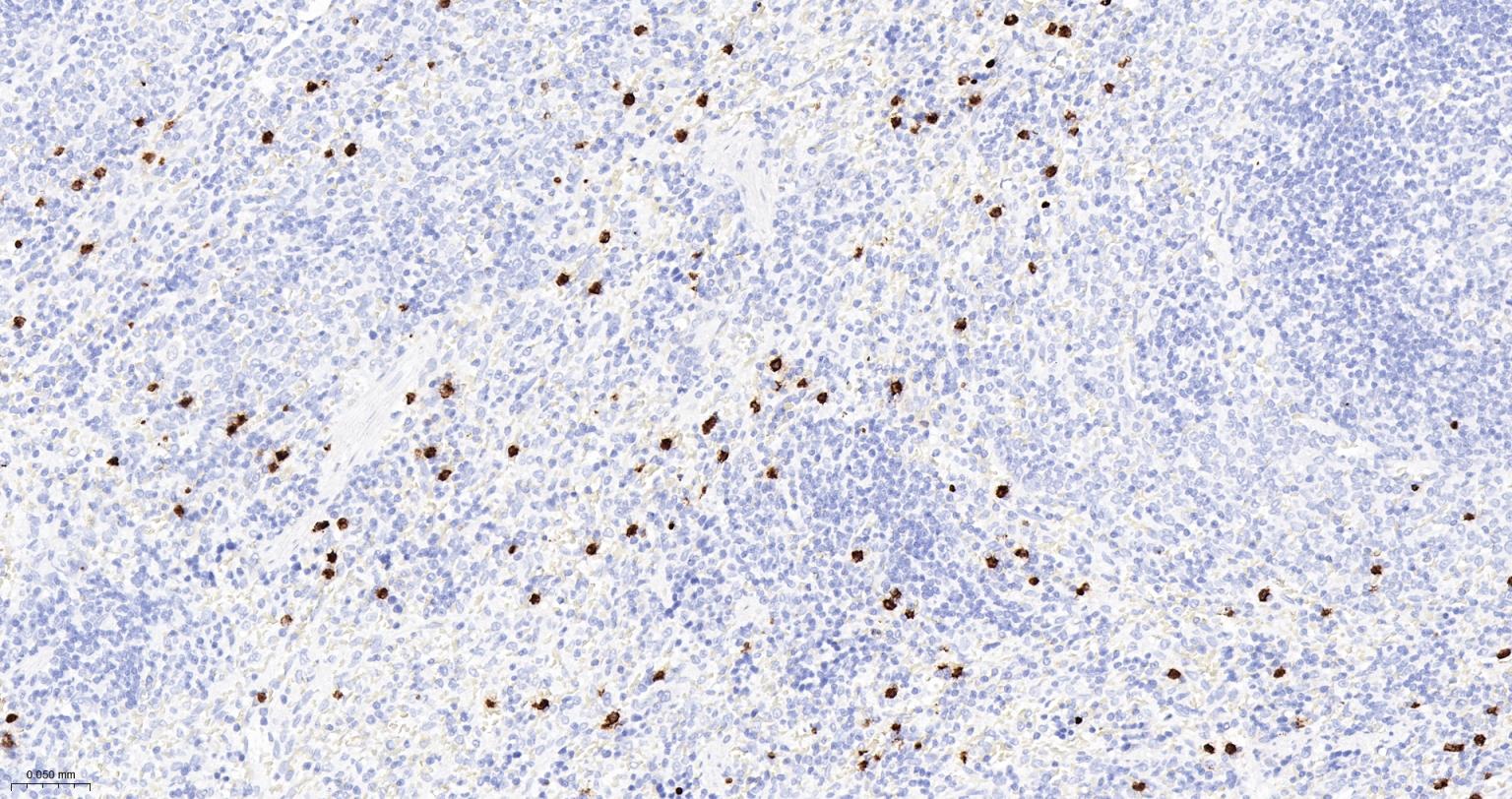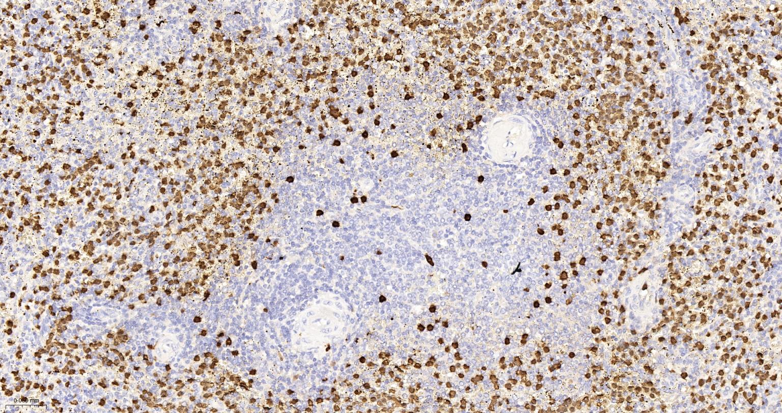 Paraformaldehyde-fixed, paraffin embedded Human Spleen; Antigen retrieval by boiling in sodium citrate buffer (pH6.0) for 15 min; Antibody incubation with S100A8 Monoclonal Antibody, Unconjugated(bsm-61167R) at 1:200 overnight at 4°C, followed by conjugation to the SP Kit (Rabbit, SP-0023)and DAB (C-0010) staining.