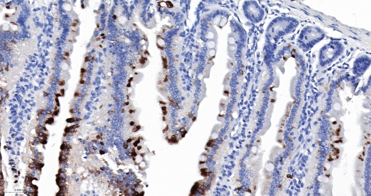 Paraformaldehyde-fixed, paraffin embedded Mouse Small Intestine; Antigen retrieval by boiling in sodium citrate buffer (pH6.0) for 15 min; Antibody incubation with S100A8 Monoclonal Antibody, Unconjugated(bsm-61167R) at 1:200 overnight at 4°C, followed by conjugation to the SP Kit (Rabbit, SP-0023)and DAB (C-0010) staining.
