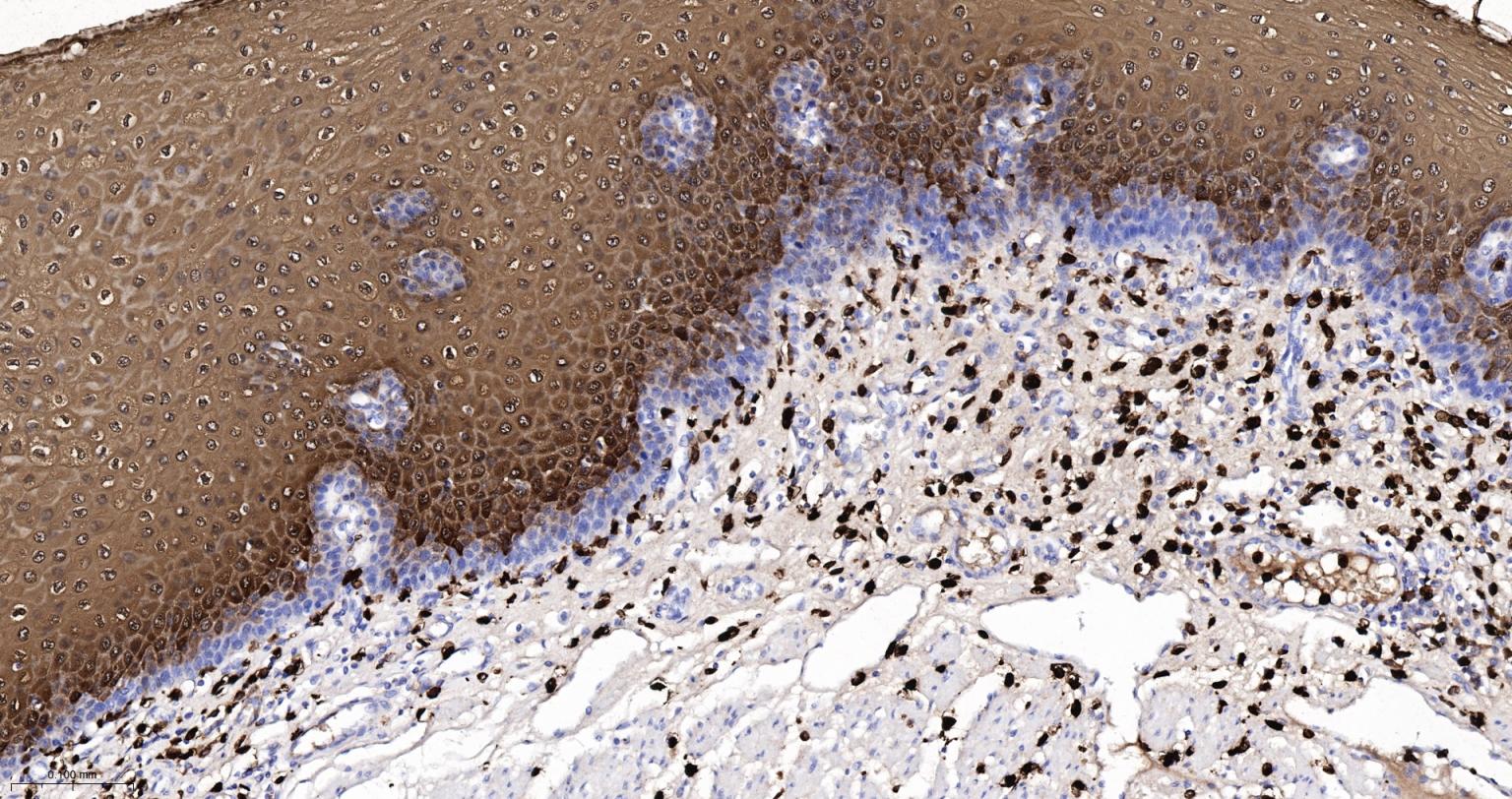 Paraformaldehyde-fixed, paraffin embedded Human Esophagus; Antigen retrieval by boiling in sodium citrate buffer (pH6.0) for 15 min; Antibody incubation with S100A8 Monoclonal Antibody, Unconjugated(bsm-61167R) at 1:200 overnight at 4°C, followed by conjugation to the SP Kit (Rabbit, SP-0023)and DAB (C-0010) staining.