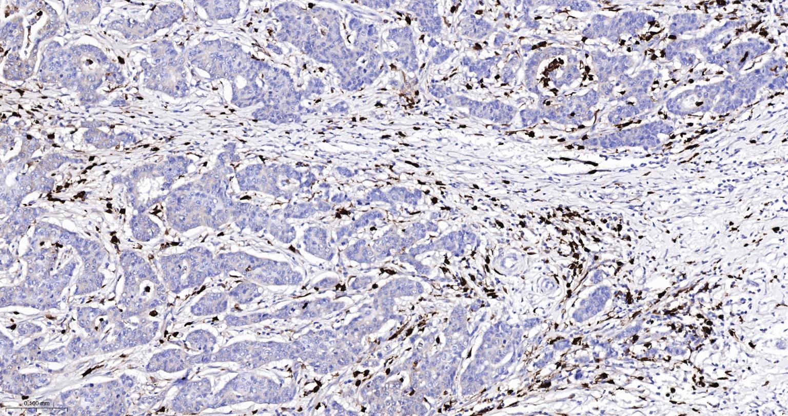 Paraformaldehyde-fixed, paraffin embedded Human Gastric Cancer; Antigen retrieval by boiling in sodium citrate buffer (pH6.0) for 15 min; Antibody incubation with S100A8 Monoclonal Antibody, Unconjugated(bsm-61167R) at 1:200 overnight at 4°C, followed by conjugation to the SP Kit (Rabbit, SP-0023)and DAB (C-0010) staining.
