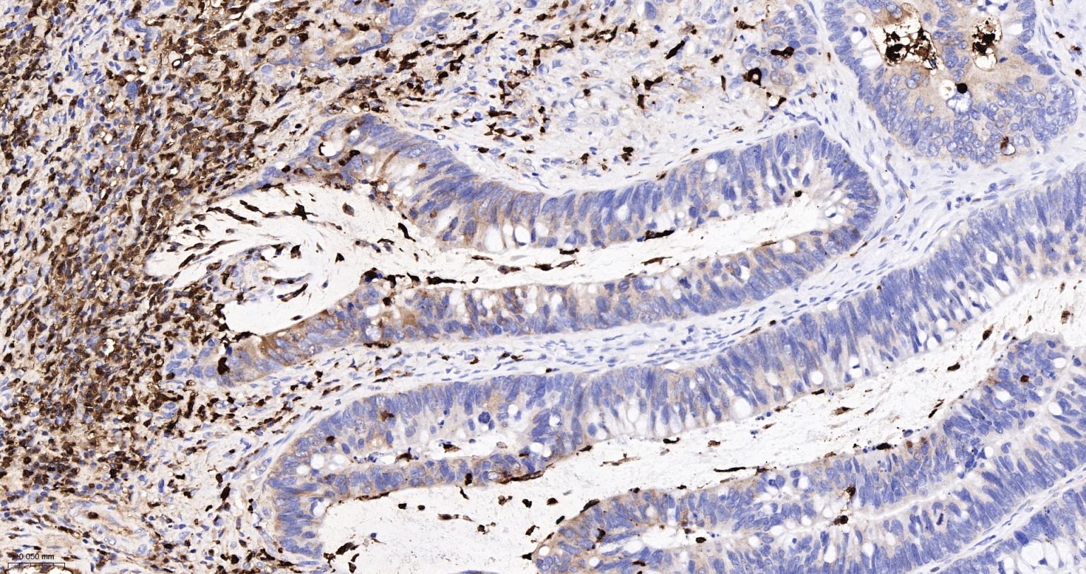 Paraformaldehyde-fixed, paraffin embedded Human Colon Cancer; Antigen retrieval by boiling in sodium citrate buffer (pH6.0) for 15 min; The section was incubated with S100A8 Monoclonal Antibody, Unconjugated (bsm-61167R) at 1:200 overnight at 4°C, followed by conjugation to the bs-0295G-HRP and DAB (C-0010) staining.