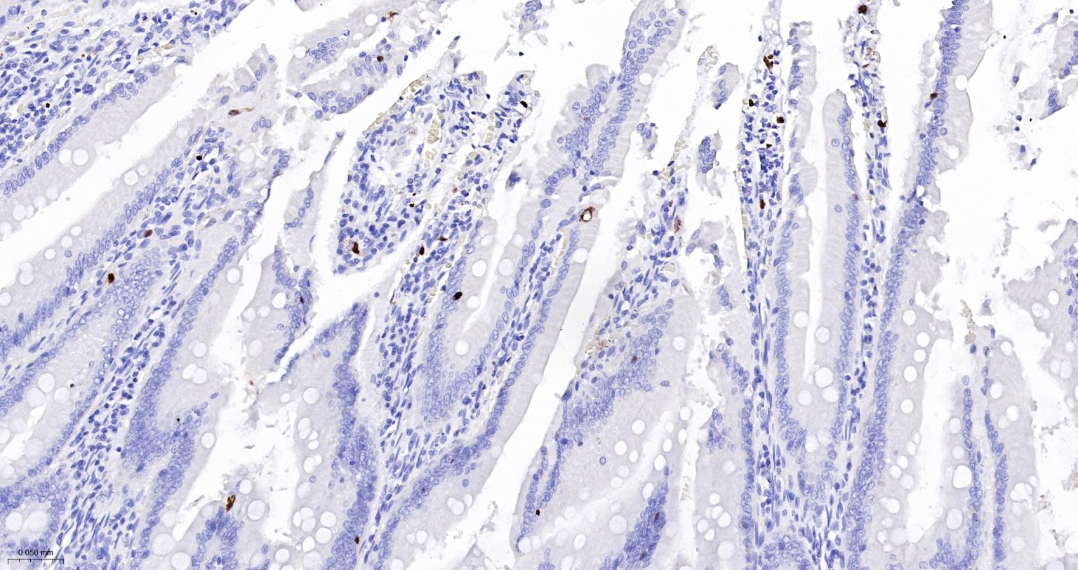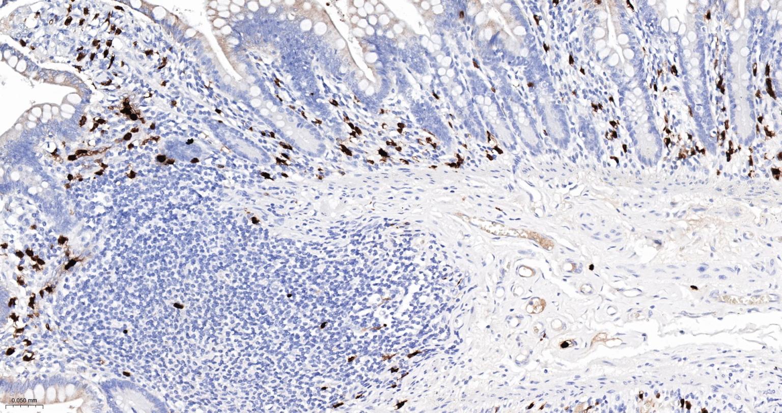 Paraformaldehyde-fixed, paraffin embedded Human Small Intestine; Antigen retrieval by boiling in sodium citrate buffer (pH6.0) for 15 min; The section was incubated with S100A8 Monoclonal Antibody, Unconjugated (bsm-61167R) at 1:200 overnight at 4°C, followed by conjugation to the bs-0295G-HRP and DAB (C-0010) staining.