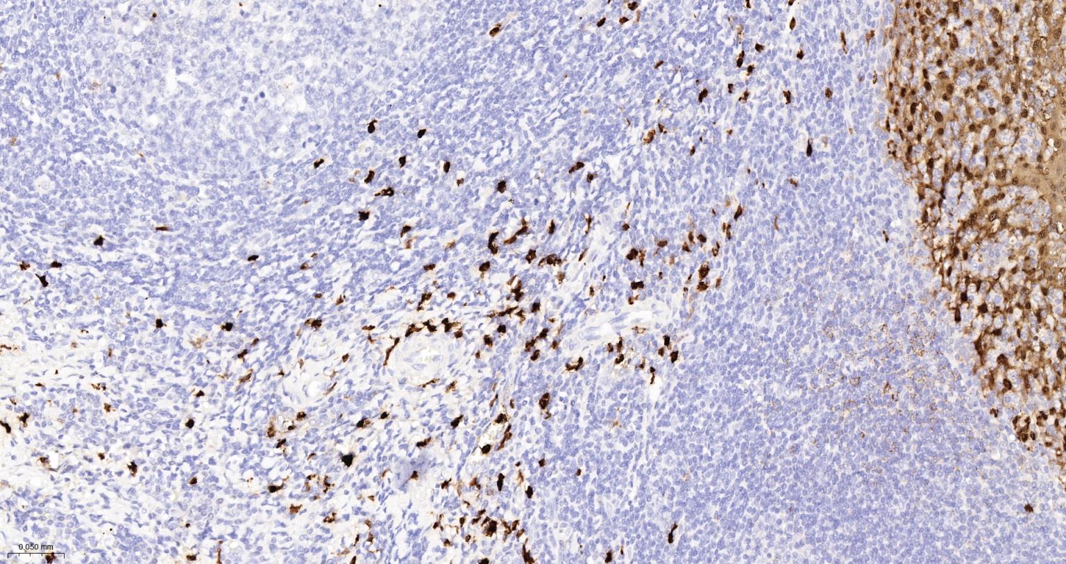 Paraformaldehyde-fixed, paraffin embedded Human Tonsil; Antigen retrieval by boiling in sodium citrate buffer (pH6.0) for 15 min; The section was incubated with S100A8 Monoclonal Antibody, Unconjugated (bsm-61167R) at 1:200 overnight at 4°C, followed by conjugation to the bs-0295G-HRP and DAB (C-0010) staining.