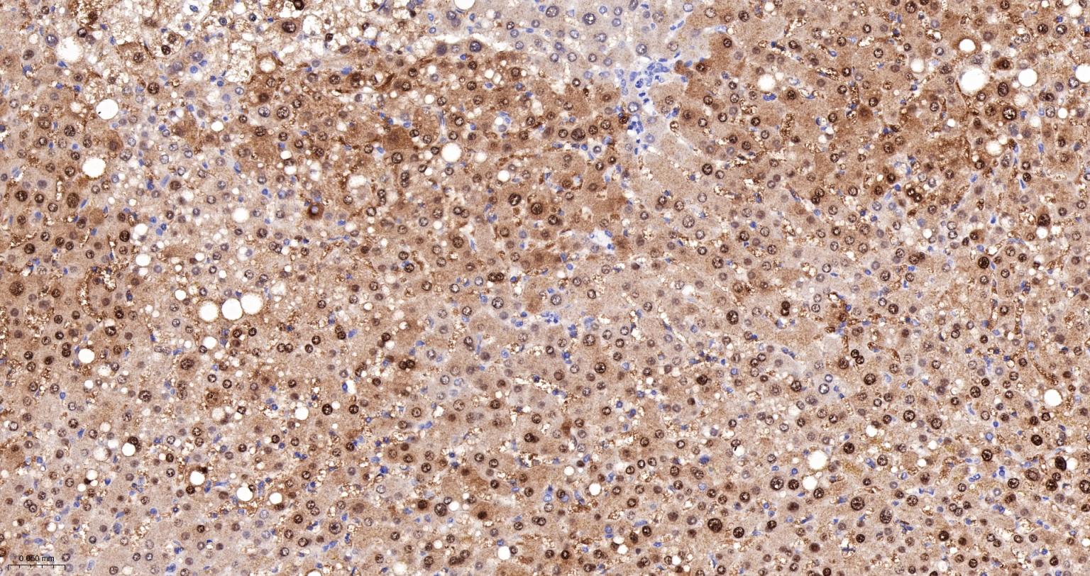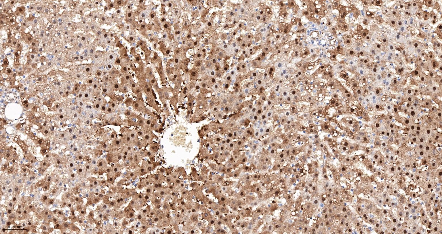 Paraformaldehyde-fixed, paraffin embedded Rat Liver; Antigen retrieval by boiling in sodium citrate buffer (pH6.0) for 15 min; The section was incubated with ALKBH1 Monoclonal Antibody, Unconjugated (bsm-61168R) at 1:200 overnight at 4°C, followed by conjugation to the bs-0295G-HRP and DAB (C-0010) staining.