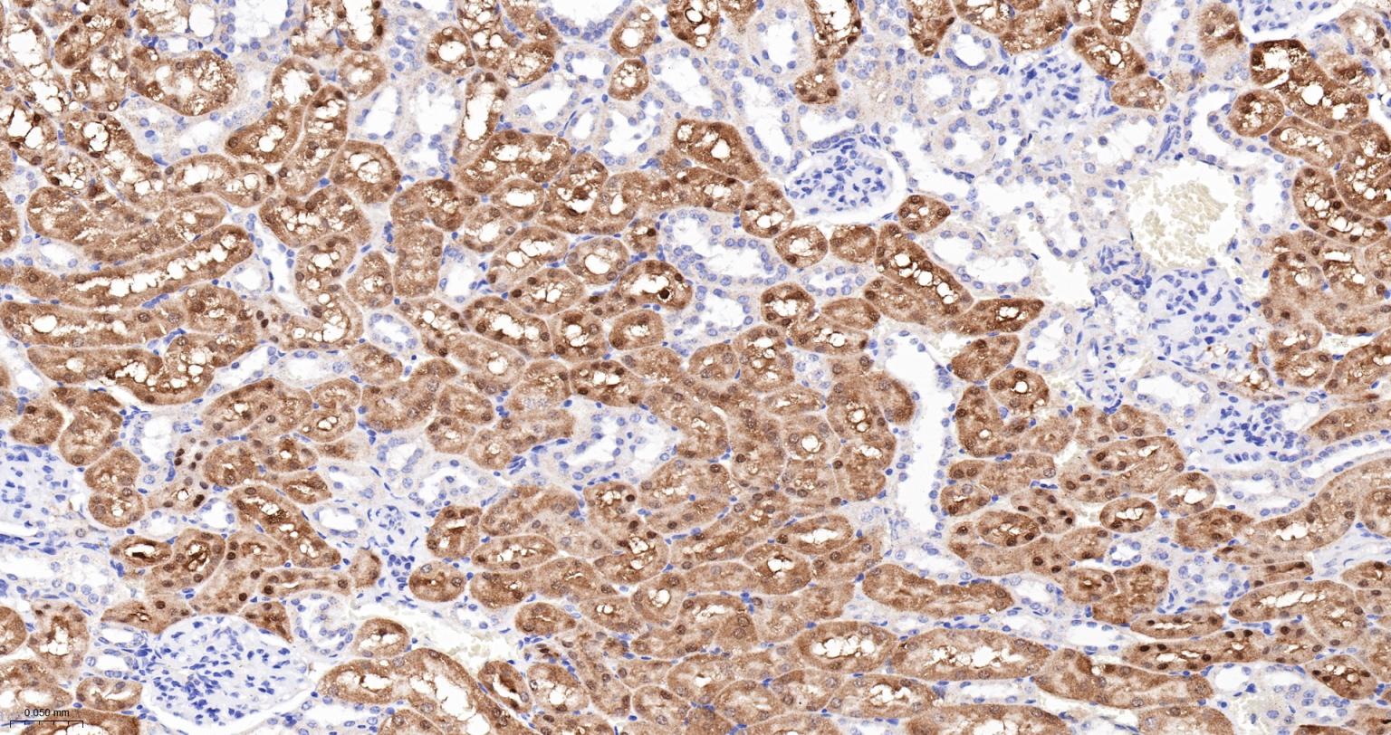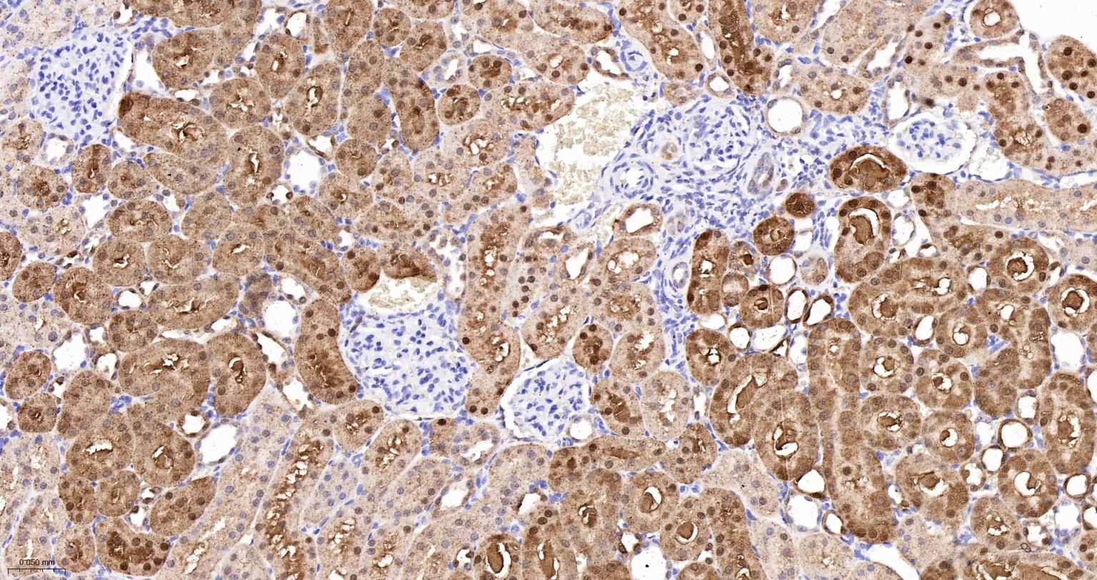 Paraformaldehyde-fixed, paraffin embedded Rat Kidney; Antigen retrieval by boiling in sodium citrate buffer (pH6.0) for 15 min; The section was incubated with ALKBH1 Monoclonal Antibody, Unconjugated (bsm-61168R) at 1:200 overnight at 4°C, followed by conjugation to the bs-0295G-HRP and DAB (C-0010) staining.