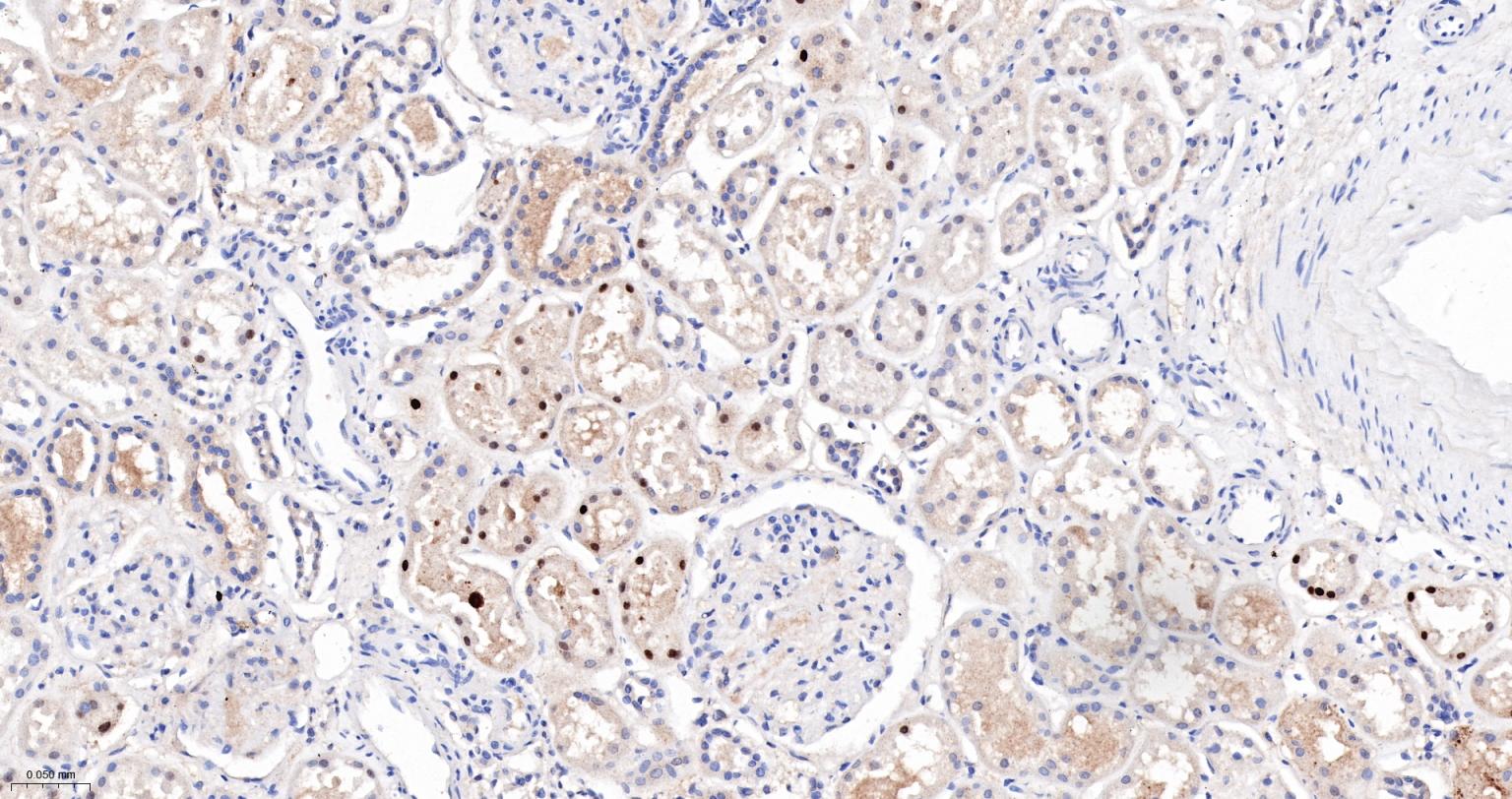 Paraformaldehyde-fixed, paraffin embedded Human Kidney; Antigen retrieval by boiling in sodium citrate buffer (pH6.0) for 15 min; The section was incubated with ALKBH1 Monoclonal Antibody, Unconjugated (bsm-61168R) at 1:200 overnight at 4°C, followed by conjugation to the bs-0295G-HRP and DAB (C-0010) staining.
