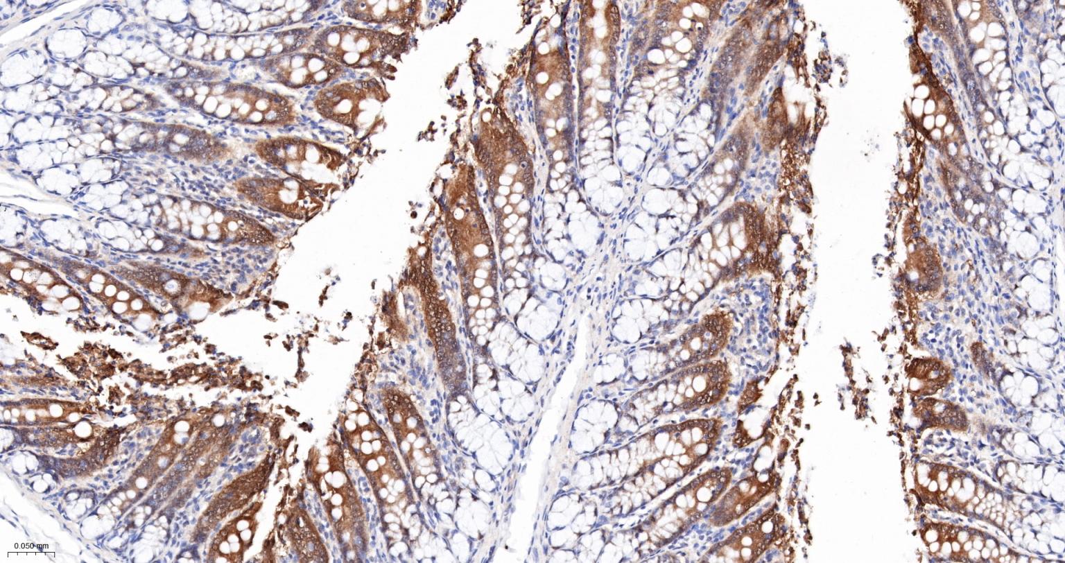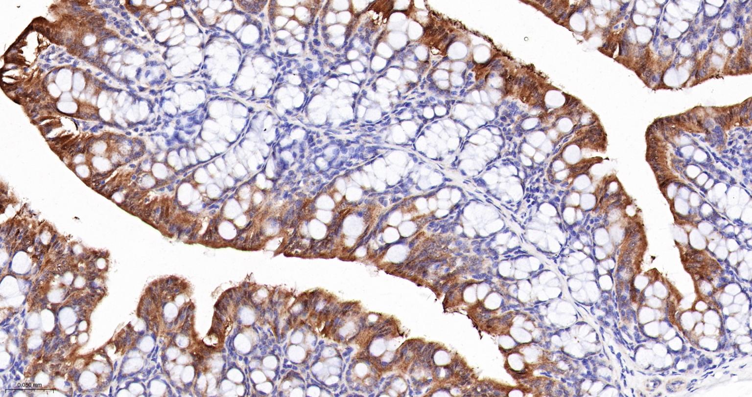 Paraformaldehyde-fixed, paraffin embedded Mouse Colon; Antigen retrieval by boiling in sodium citrate buffer (pH6.0) for 15 min; The section was incubated with ALKBH1 Monoclonal Antibody, Unconjugated (bsm-61168R) at 1:200 overnight at 4°C, followed by conjugation to the bs-0295G-HRP and DAB (C-0010) staining.