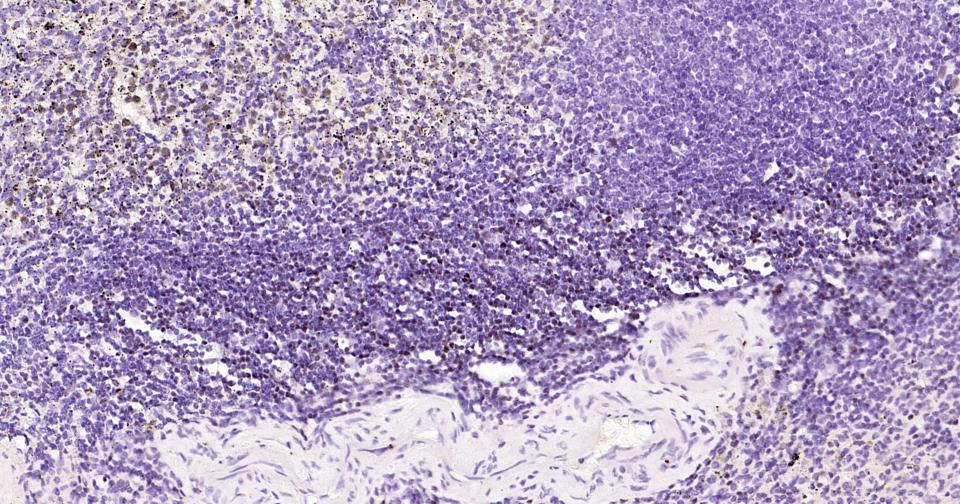 Paraformaldehyde-fixed, paraffin embedded Mouse Spleen; Antigen retrieval by boiling in sodium citrate buffer (pH6.0) for 15 min; Antibody incubation with LEF1 Monoclonal Antibody, Unconjugated(bsm-61170R) at 1:200 overnight at 4°C, followed by conjugation to the SP Kit (Rabbit, SP-0023)and DAB (C-0010) staining.