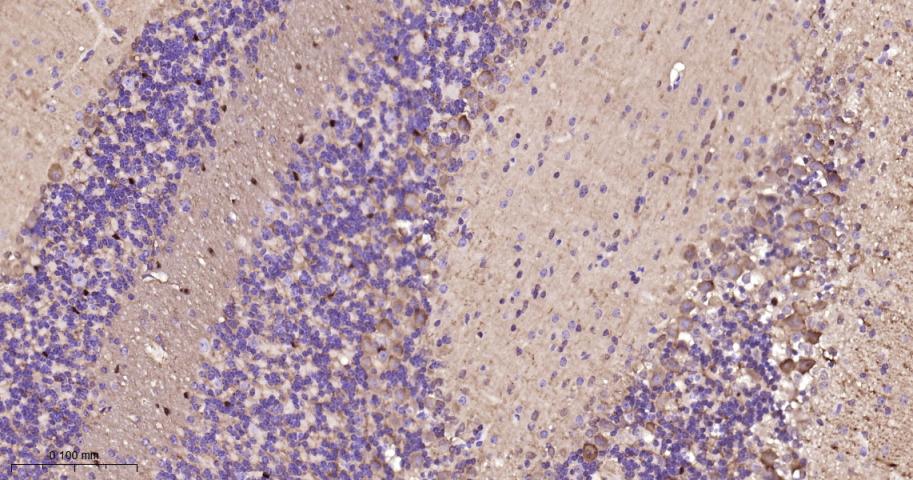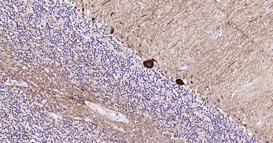 Paraformaldehyde-fixed, paraffin embedded Rat Cerebellum; Antigen retrieval by boiling in sodium citrate buffer (pH6.0) for 15 min; The section was incubated with DARPP32 Monoclonal Antibody, Unconjugated (bsm-61175R) at 1:200 overnight at 4°C, followed by conjugation to the bs-0295G-HRP and DAB (C-0010) staining.