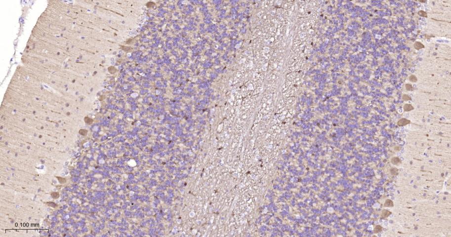 Paraformaldehyde-fixed, paraffin embedded Mouse Cerebellum; Antigen retrieval by boiling in sodium citrate buffer (pH6.0) for 15 min; The section was incubated with DARPP32 Monoclonal Antibody, Unconjugated (bsm-61175R) at 1:200 overnight at 4°C, followed by conjugation to the bs-0295G-HRP and DAB (C-0010) staining.