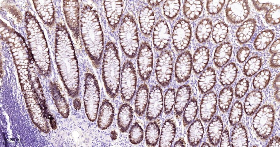 Paraformaldehyde-fixed, paraffin embedded Rat Colon; Antigen retrieval by boiling in sodium citrate buffer (pH6.0) for 15 min; The section was incubated with DARPP32 Monoclonal Antibody, Unconjugated (bsm-61175R) at 1:200 overnight at 4°C, followed by conjugation to the bs-0295G-HRP and DAB (C-0010) staining.