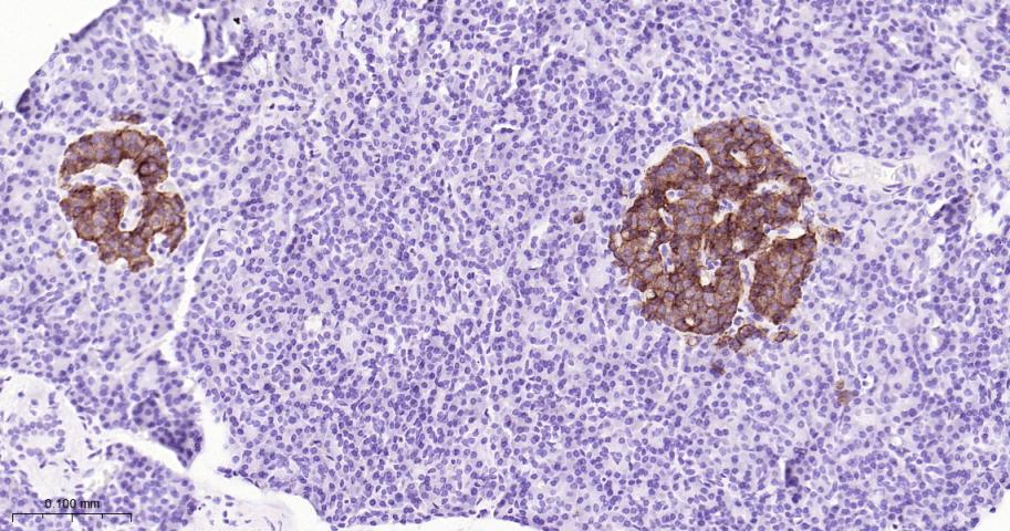 Paraformaldehyde-fixed, paraffin embedded Human Pancreas; Antigen retrieval by boiling in sodium citrate buffer (pH6.0) for 15 min; Antibody incubation with Somatostatin Receptor 2 Monoclonal Antibody, Unconjugated(bsm-61177R) at 1:200 overnight at 4°C, followed by conjugation to the bs-0295G-HRP and DAB (C-0010) staining.