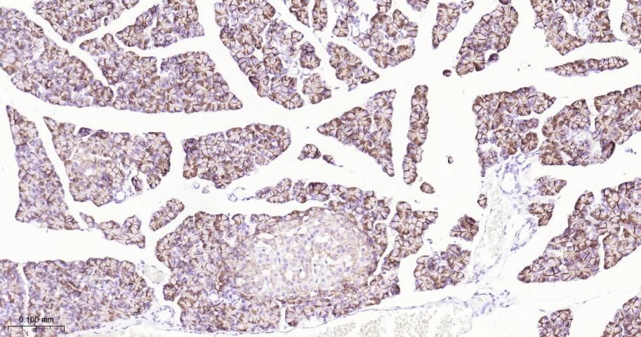 Paraformaldehyde-fixed, paraffin embedded Mouse Pancreas; Antigen retrieval by boiling in sodium citrate buffer (pH6.0) for 15 min; Antibody incubation with Somatostatin Receptor 2 Monoclonal Antibody, Unconjugated(bsm-61177R) at 1:200 overnight at 4°C, followed by conjugation to the bs-0295G-HRP and DAB (C-0010) staining.