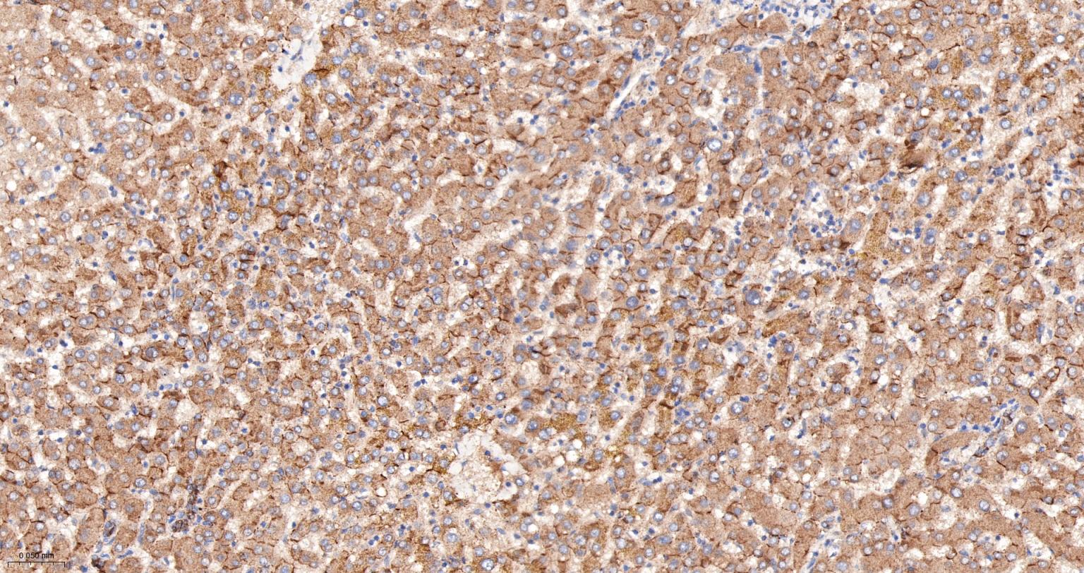 Paraformaldehyde-fixed, paraffin embedded Human Liver; Antigen retrieval by boiling in sodium citrate buffer (pH6.0) for 15 min; The section was incubated with Transferrin Monoclonal Antibody, Unconjugated (bsm-61182R) at 1:200 overnight at 4°C, followed by conjugation to the bs-0295G-HRP and DAB (C-0010) staining.