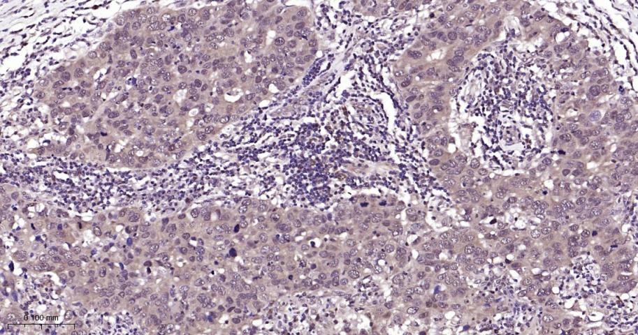 Paraformaldehyde-fixed, paraffin embedded Human Breast Cancer; Antigen retrieval by boiling in sodium citrate buffer (pH6.0) for 15 min; Antibody incubation with Hsc70 Monoclonal Antibody, Unconjugated(bsm-61188R) at 1:200 overnight at 4°C, followed by conjugation to the bs-0295G-HRP and DAB (C-0010) staining.