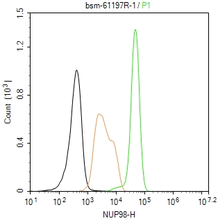 The SH-SY5Y(H) cells were fixed with 4% PFA (10 min at r.t.) and then permeabilized with 90% ice-cold methanol for 20 min at -20℃,the cells then were incubated in 5%BSA to block non-specific protein-protein interactions (30 min at r.t.), followed by secondary antibody incubation for 40 min at room temperature. Primary Antibody (green):Rabbit Anti-NUP98 antibody (bsm-61197R,1:100); Isotype Control (orange): Rabbit IgG (bs-0295P). Blank control (black): PBS. Acquisition of 20,000 events was performed.