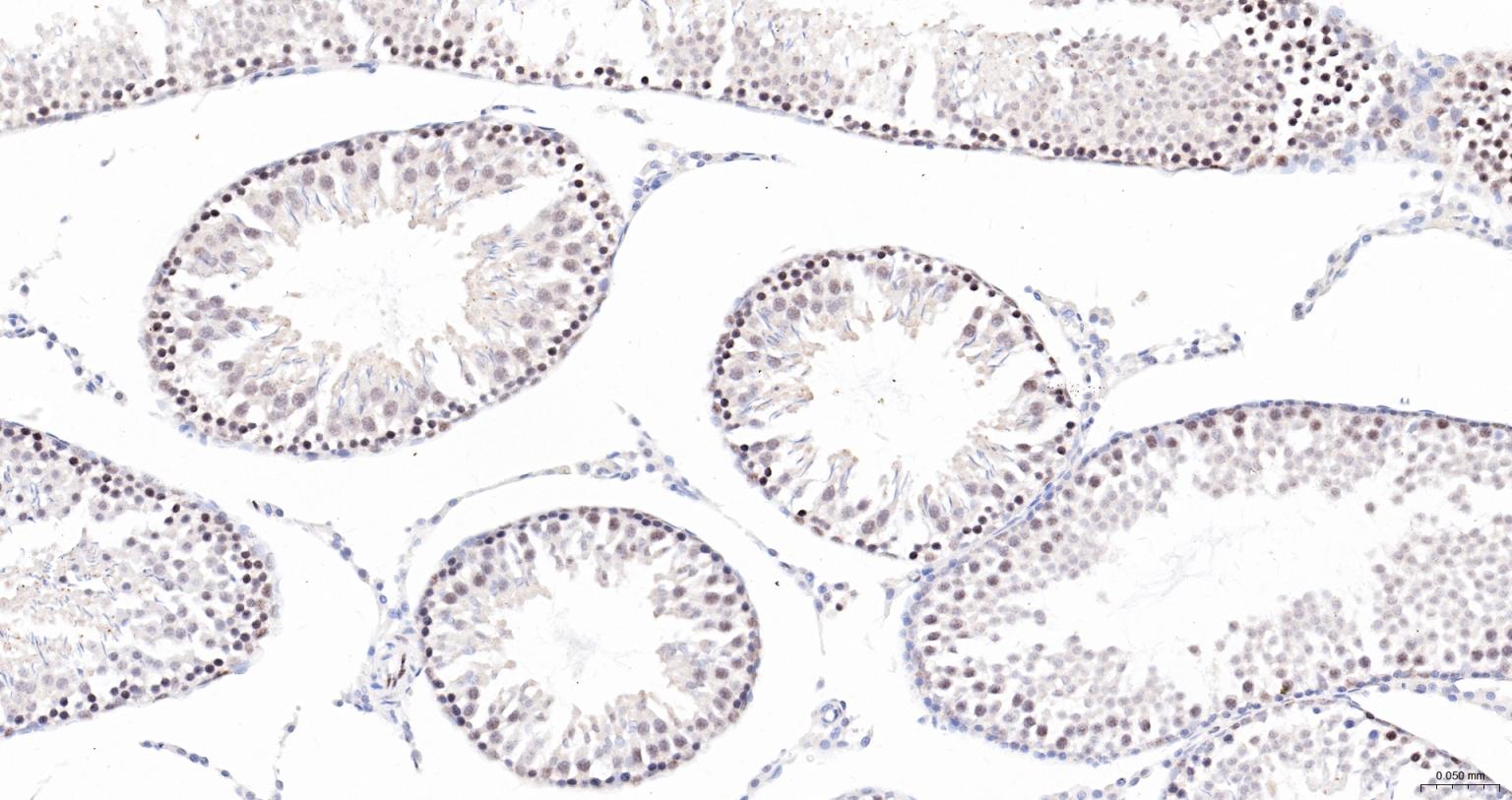 Paraformaldehyde-fixed, paraffin embedded Rat Testicles; Antigen retrieval by boiling in sodium citrate buffer (pH6.0) for 15 min; The section was incubated with NUP98 Monoclonal Antibody, Unconjugated (bsm-61197R) at 1:200 overnight at 4°C, followed by conjugation to the bs-0295G-HRP and DAB (C-0010) staining.