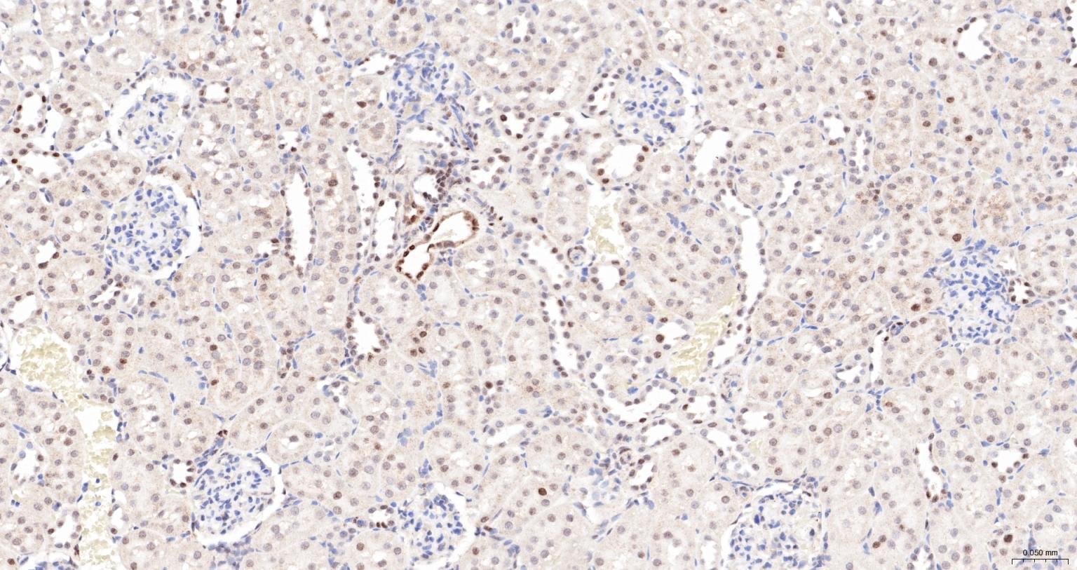 Paraformaldehyde-fixed, paraffin embedded Rat Kidney; Antigen retrieval by boiling in sodium citrate buffer (pH6.0) for 15 min; The section was incubated with NUP98 Monoclonal Antibody, Unconjugated (bsm-61197R) at 1:200 overnight at 4°C, followed by conjugation to the bs-0295G-HRP and DAB (C-0010) staining.