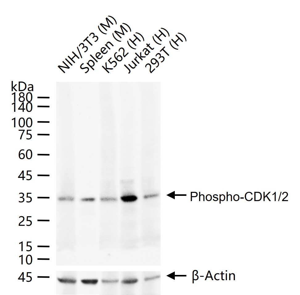 25 ug total protein per lane of various lysates (see on figure) probed with Phospho-CDK1/2 (Thr14) monoclonal antibody, unconjugated (bsm-61198R) at 1:1000 dilution and 4°C overnight incubation. Followed by conjugated secondary antibody incubation at r.t. for 60 min.