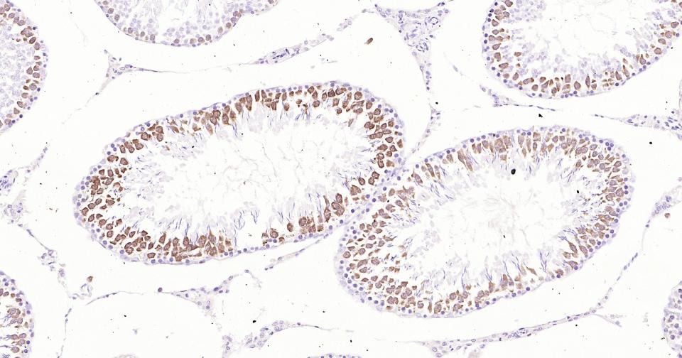 Paraformaldehyde-fixed, paraffin embedded Rat Testicles; Antigen retrieval by boiling in sodium citrate buffer (pH6.0) for 15 min; Antibody incubation with Phospho-CDK1/2 (Thr14) Monoclonal Antibody, Unconjugated(bsm-61198R) at 1:200 overnight at 4°C, followed by conjugation to the SP Kit (Rabbit, SP-0023) and DAB (C-0010) staining.