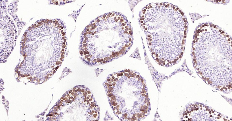 Paraformaldehyde-fixed, paraffin embedded Mouse Testicles; Antigen retrieval by boiling in sodium citrate buffer (pH6.0) for 15 min; Antibody incubation with Phospho-CDK1/2 (Thr14) Monoclonal Antibody, Unconjugated(bsm-61198R) at 1:200 overnight at 4°C, followed by conjugation to the SP Kit (Rabbit, SP-0023) and DAB (C-0010) staining.