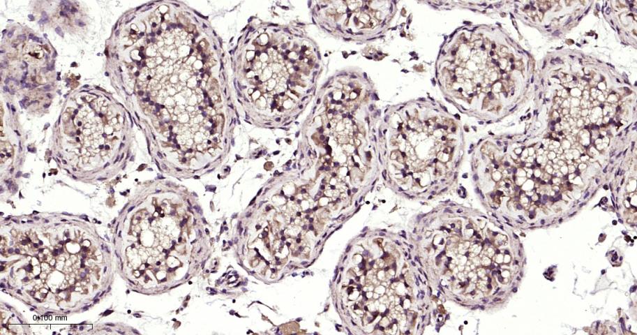 Paraformaldehyde-fixed, paraffin embedded Human Testicles; Antigen retrieval by boiling in sodium citrate buffer (pH6.0) for 15 min; Antibody incubation with ATG12 Monoclonal Antibody, Unconjugated(bsm-61199R) at 1:200 overnight at 4°C, followed by conjugation to the bs-0295G-HRP and DAB (C-0010) staining.