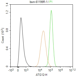 The PC-3 (H) cells were fixed with 4% PFA (10 min at r.t.) and then permeabilized with 90% ice-cold methanol for 20 min at -20℃,the cells then were incubated in 5%BSA to block non-specific protein-protein interactions (30 min at r.t.), followed by secondary antibody incubation for 40 min at room temperature. Primary Antibody (green):Rabbit Anti-ATG12 antibody (bsm-61199R,1:100); Isotype Control (orange): Rabbit IgG (bs-0295P). Blank control (black): PBS. Acquisition of 20,000 events was performed.
