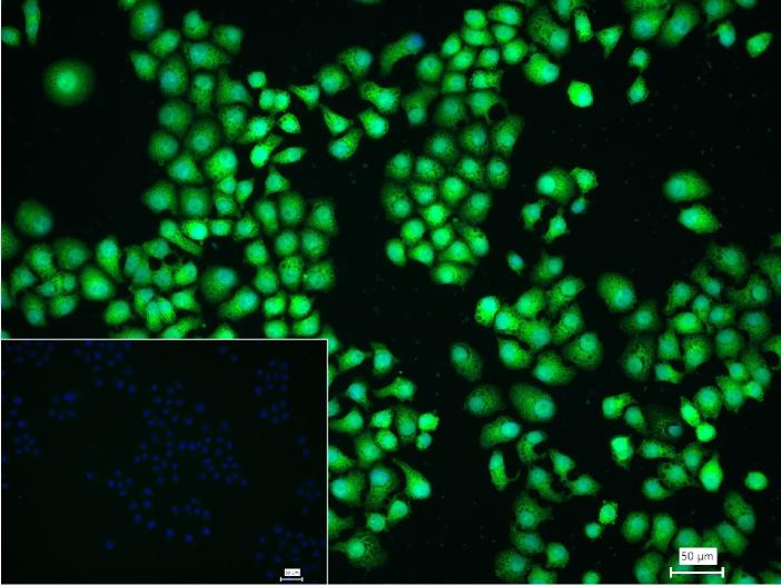 4% Paraformaldehyde-fixed HepG2 (H) cell; Triton X-100 at r.t. for 20 min; Antibody incubation with (RhoA/B/C) monoclonal Antibody, unconjugated (bsm-61200R) 1:100, 90 min at 37°C; followed by conjugated Goat Anti-Rabbit IgG antibody (green, bs-60295G-FITC) at 37°C for 90 min, DAPI (blue, C02-04002) was used to stain the cell nuclei. PBS instead of the primary antibody was used as the blank control.