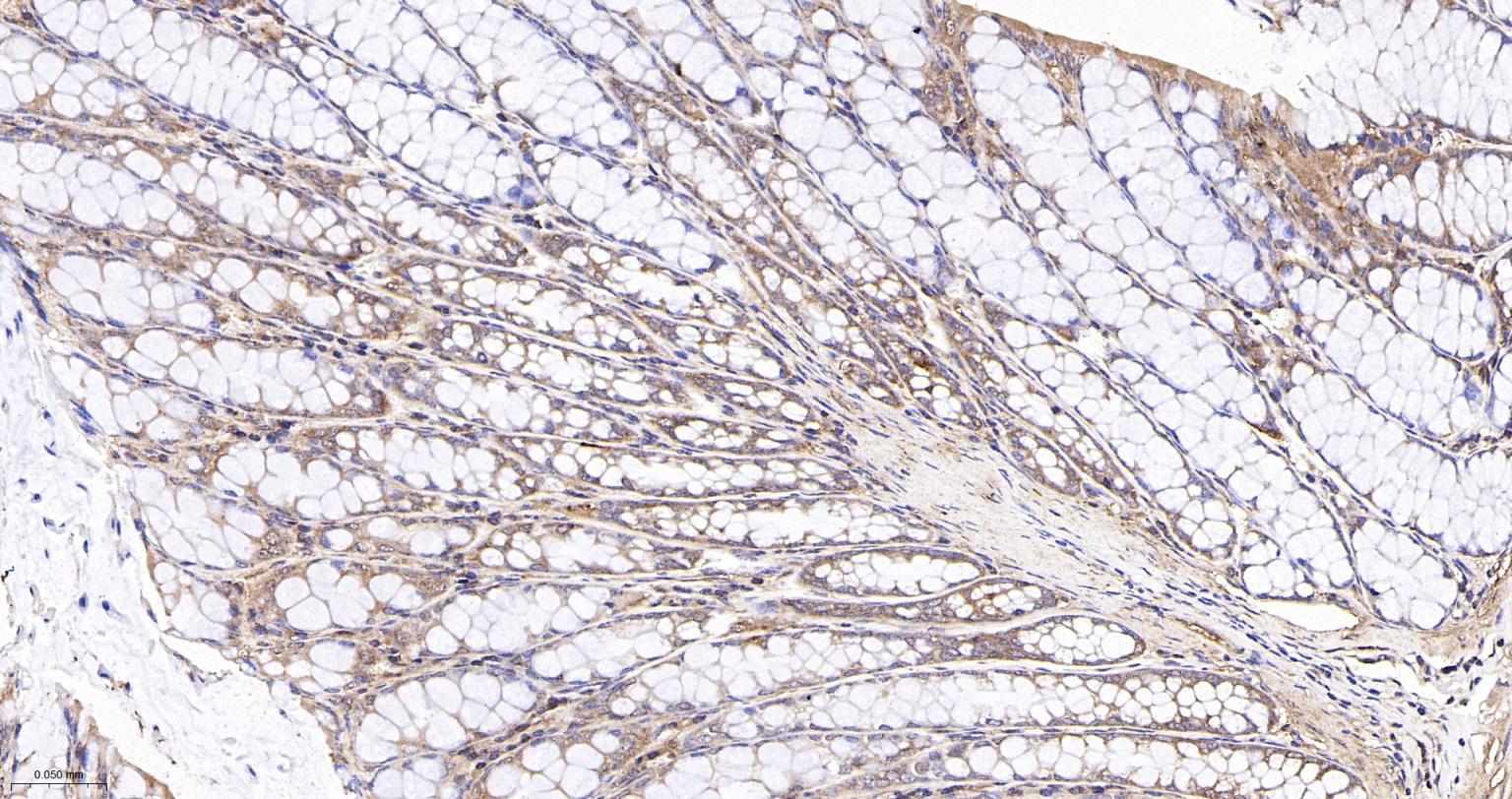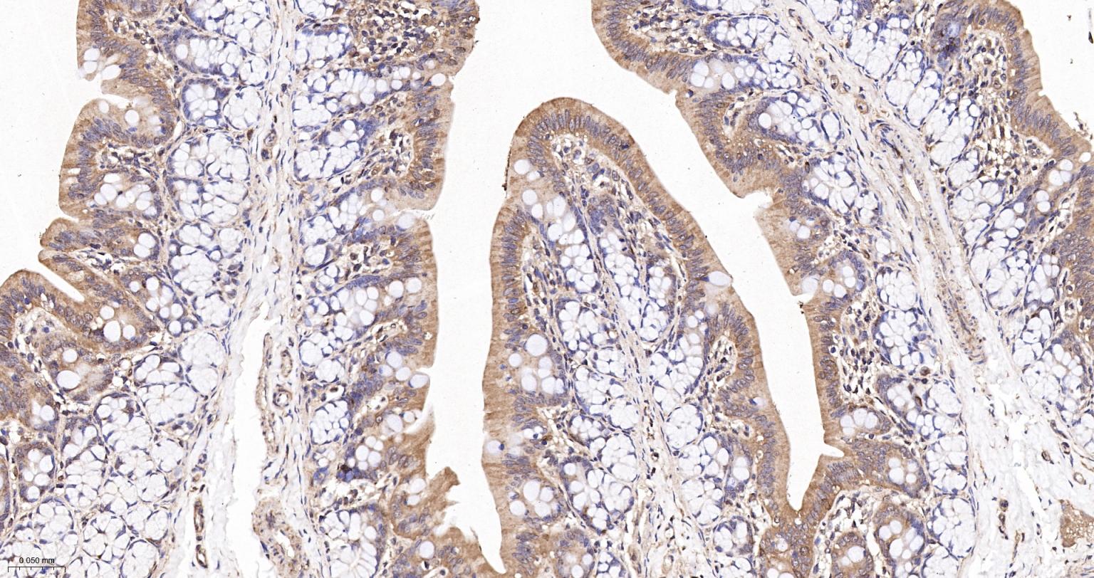 Paraformaldehyde-fixed, paraffin embedded Mouse colon; Antigen retrieval by boiling in sodium citrate buffer (pH6.0) for 15 min; Antibody incubation with RhoA/B/C Monoclonal Antibody, Unconjugated (bsm-61200R) at 1:200 overnight at 4°C, followed by conjugation to the bs-0295G-HRP and DAB (C-0010) staining.