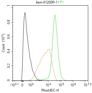 The HepG2 (H) cells were fixed with 4% PFA (10 min at r.t.) and then permeabilized with 90% ice-cold methanol for 20 min at -20℃,the cells then were incubated in 5%BSA to block non-specific protein-protein interactions (30 min at r.t.), followed by secondary antibody incubation for 40 min at room temperature. Primary Antibody (green):Rabbit Anti-RhoA/B/C antibody (bsm-61200R,1:100); Isotype Control (orange): Rabbit IgG (bs-0295P). Blank control (black): PBS. Acquisition of 20,000 events was performed.
