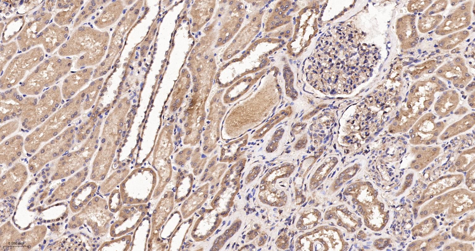 Paraformaldehyde-fixed, paraffin embedded Human kidney; Antigen retrieval by boiling in sodium citrate buffer (pH6.0) for 15 min; Antibody incubation with RhoA/B/C Monoclonal Antibody, Unconjugated (bsm-61200R) at 1:200 overnight at 4°C, followed by conjugation to the bs-0295G-HRP and DAB (C-0010) staining.