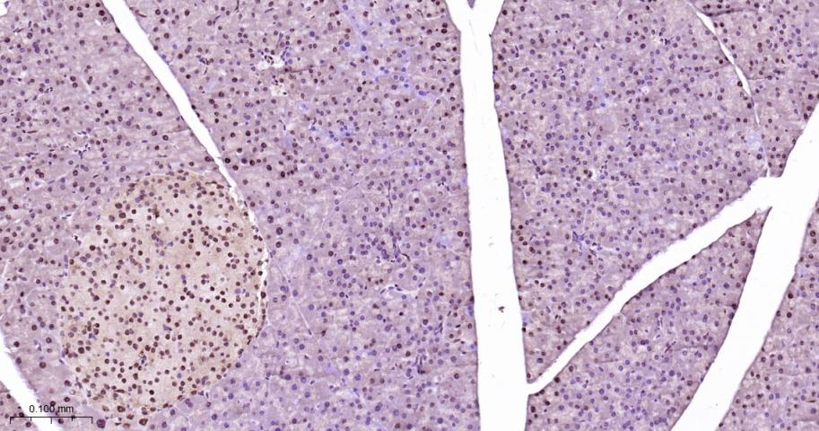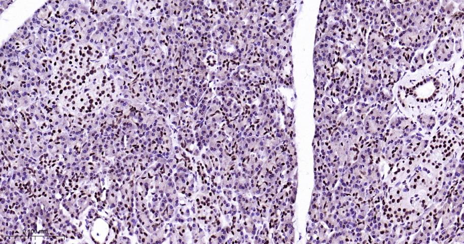 Paraformaldehyde-fixed, paraffin embedded Rat pancreas; Antigen retrieval by boiling in sodium citrate buffer (pH6.0) for 15 min; Antibody incubation with HP1 alpha Monoclonal Antibody, Unconjugated(bsm-61202R) at 1:200 overnight at 4°C, followed by conjugation to the bs-0295G-HRP and DAB (C-0010) staining.