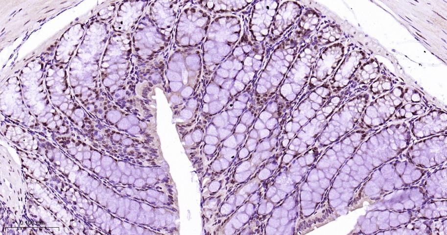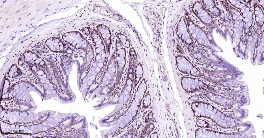 Paraformaldehyde-fixed, paraffin embedded Mouse colon; Antigen retrieval by boiling in sodium citrate buffer (pH6.0) for 15 min; Antibody incubation with HP1 alpha Monoclonal Antibody, Unconjugated(bsm-61202R) at 1:200 overnight at 4°C, followed by conjugation to the bs-0295G-HRP and DAB (C-0010) staining.