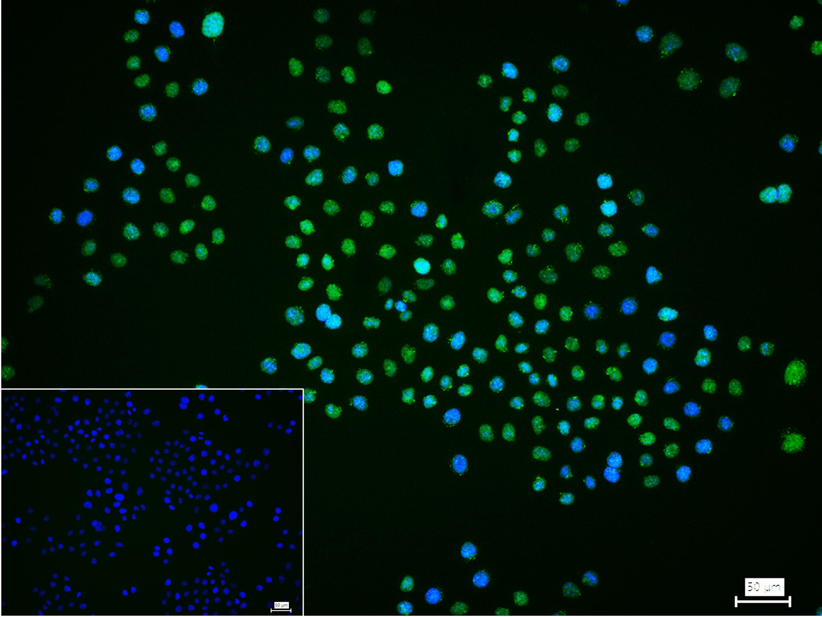4% Paraformaldehyde-fixed Hela (H) cell; Triton X-100 at r.t. for 20 min; Antibody incubation with (HP1 alpha) monoclonal Antibody, unconjugated (bsm-61202R) 1:100, 90 min at 37°C; followed by conjugated Goat Anti-Rabbit IgG antibody (green, bs-40295G-FITC) at 37°C for 90 min, DAPI (blue, C02-04002) was used to stain the cell nuclei. PBS instead of the primary antibody was used as the blank control.