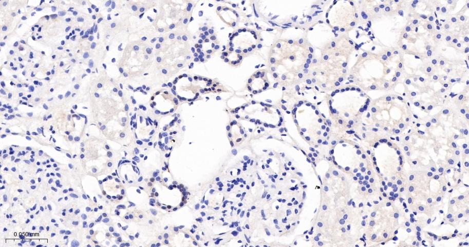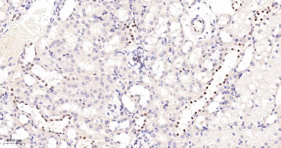 Paraformaldehyde-fixed, paraffin embedded Rat Kidney; Antigen retrieval by boiling in sodium citrate buffer (pH6.0) for 15 min; The section was incubated with GATA2/3 Monoclonal Antibody, Unconjugated (bsm-61203R) at 1:200 overnight at 4°C, followed by conjugation to the bs-0295G-HRP and DAB (C-0010) staining.