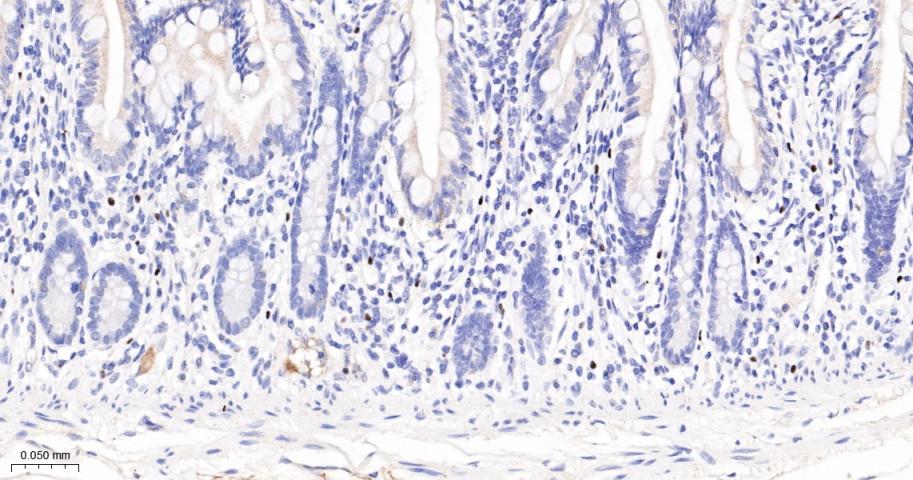 Paraformaldehyde-fixed, paraffin embedded Human Small Intestine; Antigen retrieval by boiling in sodium citrate buffer (pH6.0) for 15 min; The section was incubated with GATA2/3 Monoclonal Antibody, Unconjugated (bsm-61203R) at 1:200 overnight at 4°C, followed by conjugation to the bs-0295G-HRP and DAB (C-0010) staining.