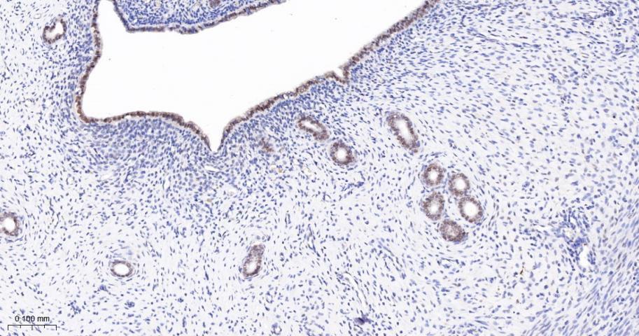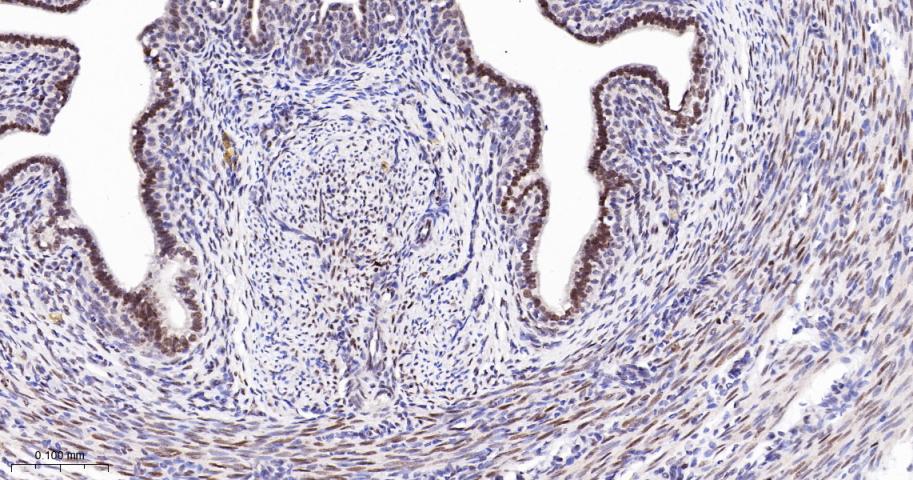 Paraformaldehyde-fixed, paraffin embedded Mouse Uterus; Antigen retrieval by boiling in sodium citrate buffer (pH6.0) for 15 min; The section was incubated with GATA2/3 Monoclonal Antibody, Unconjugated (bsm-61203R) at 1:200 overnight at 4°C, followed by conjugation to the bs-0295G-HRP and DAB (C-0010) staining.