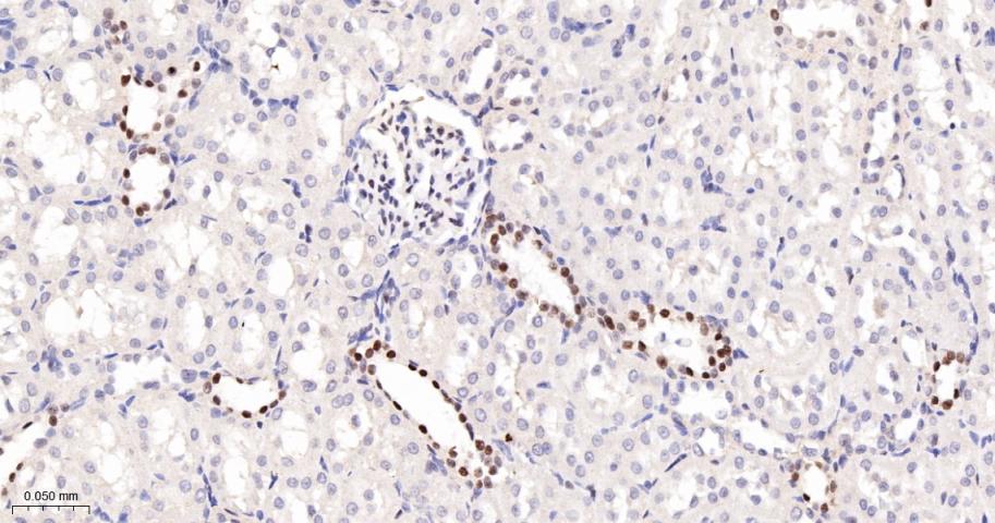 Paraformaldehyde-fixed, paraffin embedded Mouse Kidney; Antigen retrieval by boiling in sodium citrate buffer (pH6.0) for 15 min; The section was incubated with GATA2/3 Monoclonal Antibody, Unconjugated (bsm-61203R) at 1:200 overnight at 4°C, followed by conjugation to the bs-0295G-HRP and DAB (C-0010) staining.