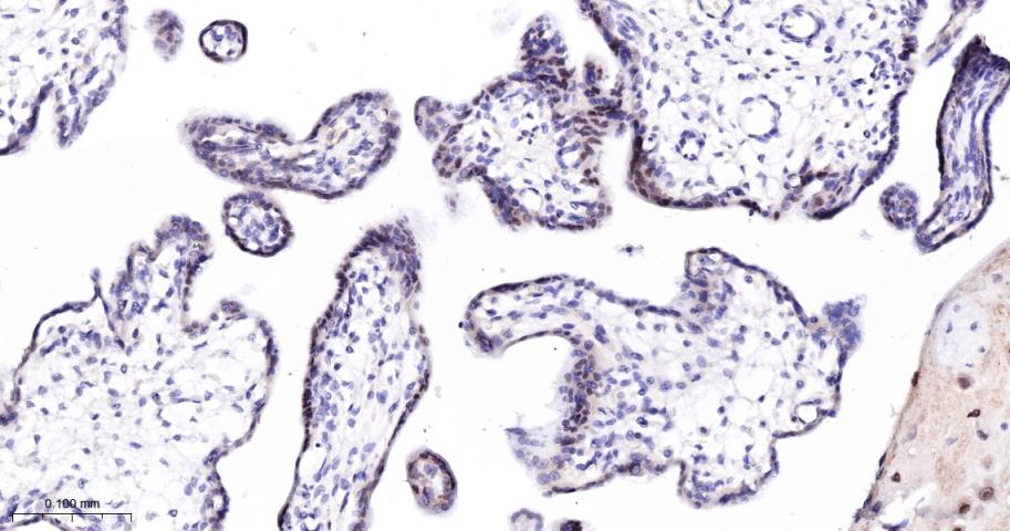 Paraformaldehyde-fixed, paraffin embedded Human Placenta; Antigen retrieval by boiling in sodium citrate buffer (pH6.0) for 15 min; The section was incubated with GATA2/3 Monoclonal Antibody, Unconjugated (bsm-61203R) at 1:200 overnight at 4°C, followed by conjugation to the bs-0295G-HRP and DAB (C-0010) staining.