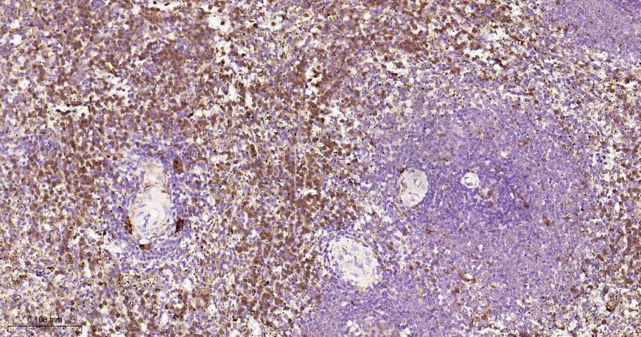 Paraformaldehyde-fixed, paraffin embedded Human Spleen; Antigen retrieval by boiling in sodium citrate buffer (pH6.0) for 15 min; The section was incubated with ATG7 Monoclonal Antibody, Unconjugated (bsm-61206R) at 1:200 overnight at 4°C, followed by conjugation to the bs-0295G-HRP and DAB (C-0010) staining.