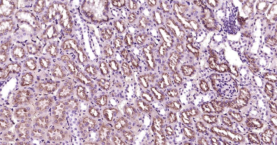 Paraformaldehyde-fixed, paraffin embedded Mouse kidney; Antigen retrieval by boiling in sodium citrate buffer (pH6.0) for 15 min; Antibody incubation with LAMP2 Monoclonal Antibody, Unconjugated (bsm-61207R) at 1:200 overnight at 4°C, followed by conjugation to the bs-0295G-HRP and DAB (C-0010) staining.