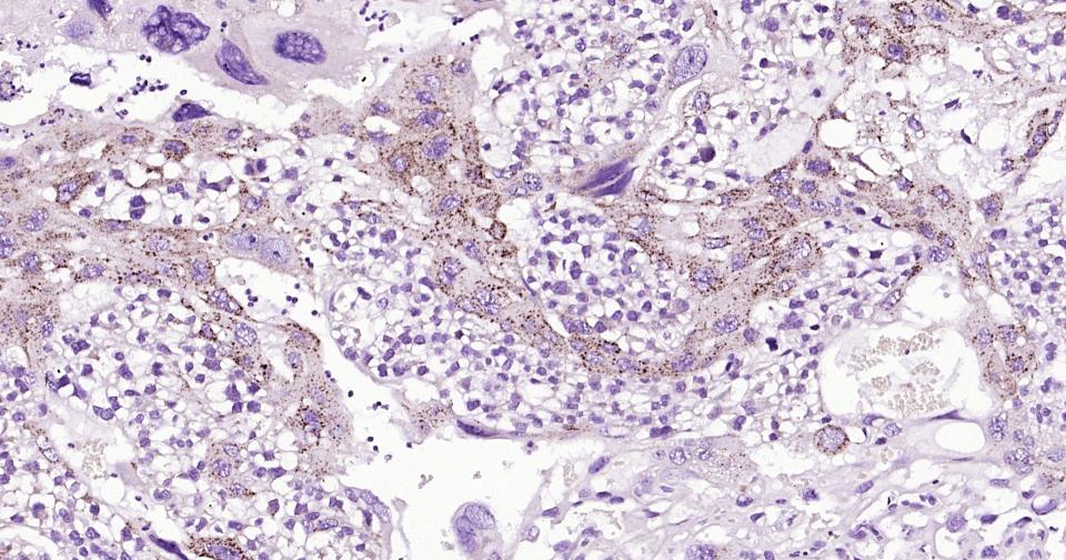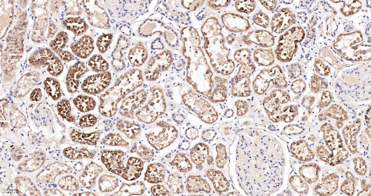 Paraformaldehyde-fixed, paraffin embedded Human kidney;Antigen retrieval by boiling in sodium citrate buffer (pH6.0) for 15 min; Antibody incubation with LAMP2 Monoclonal Antibody, Unconjugated (bsm-61207R) at 1:200 overnight at 4°C, followed by conjugation to the bs-0295G-HRP and DAB (C-0010) staining.